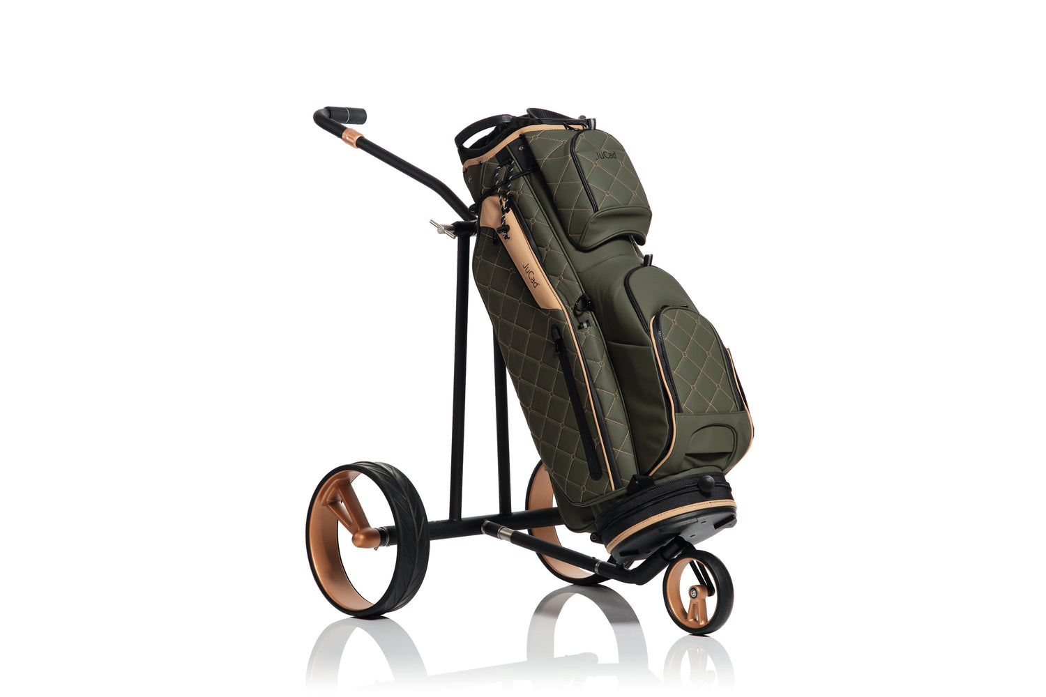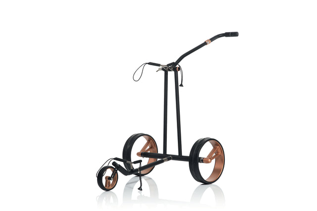 Mit seinen eleganten Einspeichen-Vollcarbonfelgen im edlen Rosé-Gold Design zieht der JuCad Phantom Titan Rosé 3.0 alle Blicke auf sich. Feine Details in Rosé-Gold-Optik verleihen dem Elektrocaddy eine besonders hochwertige Ausstrahlung und machen ihn zu einem echten Blickfang auf dem Golfplatz. Der schlanke Titanrahmen, die charakteristische Einarmschwinge am Vorderrad sowie die elegante Griffstange mit stufenlosem Geschwindigkeitsregler lassen den Trolley wie eine schwebende Erscheinung wirken.